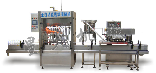 全自动直线式牛奶灌装流水线: 全自动直线式牛奶灌装流水线由输送带、全自动直线式灌装机、立式贴标机、自动旋盖机、送瓶机组成,全自动完成理瓶、送瓶、灌装、封口、旋盖、贴标、收瓶等功能,针对液体产品进行灌装生产,适用于牛奶、果汁、调味品、化妆品、洗涤用品、农药、医药产品、石油产品等液体的灌装。  |
